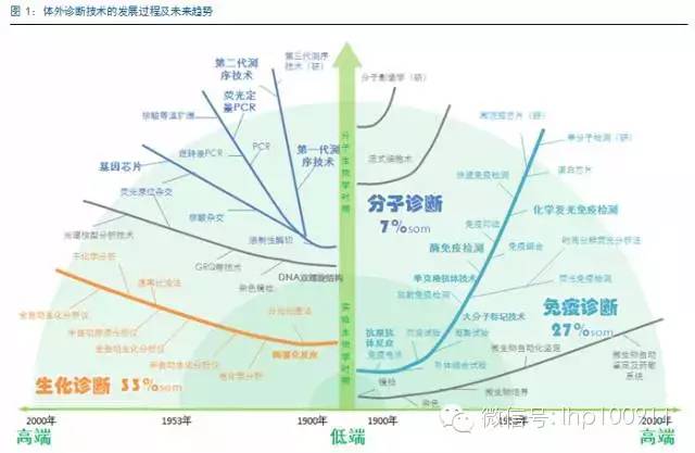 體外診斷行業的發展伴隨生物化學、免疫學、分子生物學等領域的發展而發展,可分為三個發展階段。第一階段,20世紀之前萌芽時期,使用一些傳統的醫學診斷技術;第二階段,20世紀初期,隨著現代醫學的發展及酶催化反應與抗原抗體反應的發現,體外診斷逐步興起。第三階段,1953年后,DNA雙螺旋結構、單克隆抗體技術、大分子標記技術等技術的運用推動整個體外診斷行業跨越式發展。