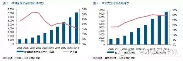 隨著新醫改的推行,醫保覆蓋率和覆蓋水平大幅提高,隨之醫保節余率下降,醫保壓力逐年增加。2014年城鎮基本醫保基金支出8134億元,結余1528億元,結余率僅為15.78%。以2008-2014年結余率下降速度推測,至2020年全國城鎮基本醫保基金將首次見底。