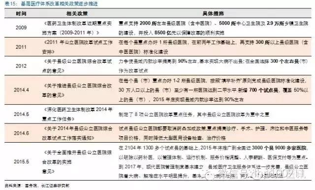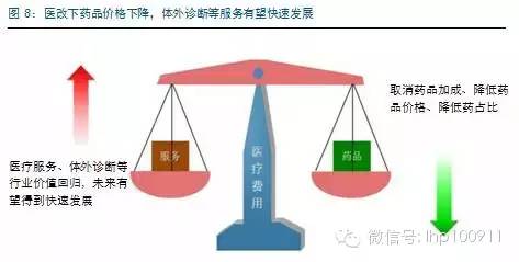 另一方面,計劃經濟時代醫院遺留下的15%的藥品加成收入將在醫改過程中逐步取消。而醫院作為一個經濟體,未來會將更多注意力投入醫療服務或診斷科室,以彌補其藥品收入下降的損失。“重藥品,輕服務”現狀將逐步得到糾正,醫療服務及體外診斷將在此消彼長中得到快速發展。