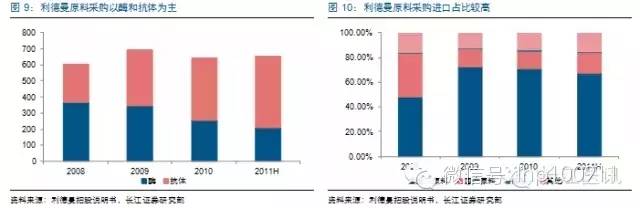 由于生產工藝、產物純度等因素影響,國產原料離生產要求仍存在一定差距,目前診斷酶、抗體等主要原料仍依賴國外進口。以2011年上市的利德曼為例,2008年-2011年中進口原料成本費用均在總成本50%以上,其中2011年進口原料成本占比67.19%。考慮到利德曼是少數原料研發上有較多突破的公司,我們預計全國原料平均進口成本占比在70%以上。