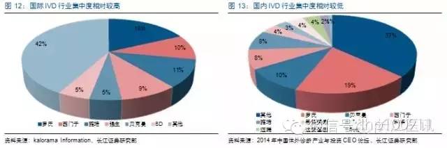 目前國際體外診斷市場行業集中度相對較高,羅氏、西門子、雅培、強生、貝克曼、BD等6大企業占據體外診斷市場近60%的市場份額,壟斷優勢明顯。國內行業集中度相對較低,規模最大的的科華生物2014年營業收入12.18億元,相較于2014年305億元的國內市場,市場占有率不到4%,國內企業集中度相對較低,同時也意味著國內企業未來有更多的發展機遇。