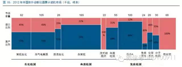 試劑方面,高端市場仍以進口產品為主。從2012年國內體外診斷試劑細分行業來看。低端的生化國產試劑已逐步超過進口試劑,如血氣電解質、尿液生化檢測等領域市場份額均已超過60%。免疫檢測雖然在酶聯免疫方面取得一定的突破,但高端的化學放光檢測依舊為外資企業所壟斷,2012年市占率僅為18%。分子診斷方面由于對原料要求相對較低,國內試劑發展較為迅速,2012年市占率達到72%。此外血液檢測的流式細胞術及微生物檢測方面,國內進展較為緩慢,大部分診斷試劑仍需進口。