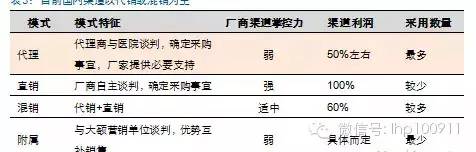 營銷渠道上以代理為主,直銷為輔。目前體外診斷行業企業主要選擇三種銷售模式來銷售產品:自建渠道、通過專業經銷商或與產業鏈上大額營銷單位(如體外診斷儀器生產商)進行優勢互補來銷售其產品。幾種模式在產業鏈的利潤分配上有所不同。直銷模式中,企業能更貼近終端客戶,更有效了解醫院需求,增強客戶黏性,但費用較高;而代理制模式下一般企業會以終端價格的一定比例向經銷商供貨,由經銷商處理各種費用;第三種附屬大額營銷單位的則通常是有一定產品優勢但缺乏一定渠道的小型創新型試劑生產公司的經營模式。