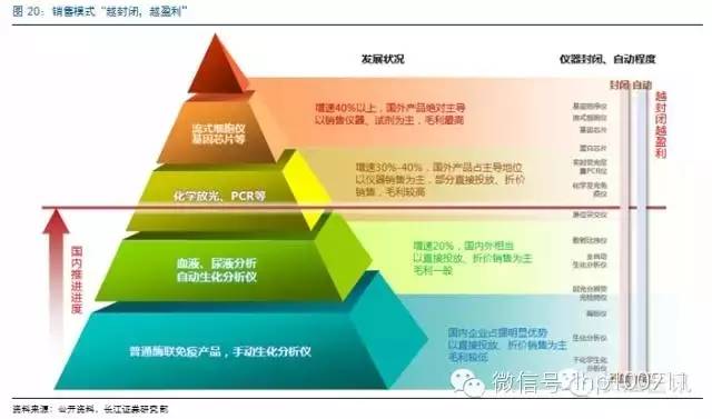 生化診斷:競爭日趨激烈,但隨著醫療中樞的下移,基層市場對性價比較高的生化診斷需求釋放,穩健發展有望維持。免疫診斷:酶聯免疫的化學發光替代大勢所趨,技術領先企業將率先享受技術溢價。分子診斷:市場占比最小,發展最快的子行業。隨著基因測序的興起,有望成為IVD行業的主流之一。