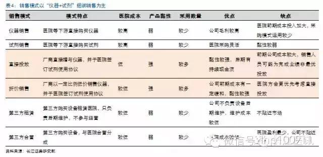銷售模式以“儀器+試劑”捆綁銷售為主。體外診斷設備或試劑的銷售模式主要有儀器或試劑的直接銷售、直接投放、折價銷售、第三方租賃與第三方合營等模式。其中直接投放最為普遍,廠商免費贈與設備并合同約定在未來的一段時間內需購買其對應試劑。這種營銷模式在一定程度上保證了客戶黏性,但在實際操作過程中往往由于銷售人員為完成業績而非最優投放而有較大的損失。折價銷售在一定程度上避免了此類問題的出現,但作為下游醫院方會優先考慮直接投放模式。因此實際過程中兩種銷售模式各有所長,主要看看廠商與醫院方的議價能力與技術先進程度等。