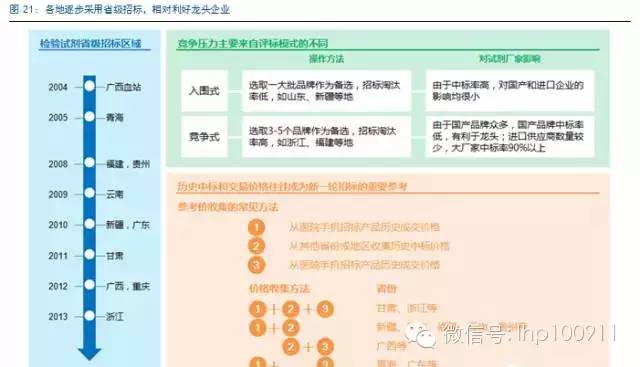 傳統體外診斷設備及試劑招標一般為各地醫院自主招標采購。自2004年廣西省血站采用省級招標后,此后9年青海、福建、貴州、云南、新疆、廣東、甘肅、廣西、重慶、浙江等11省陸續采用省級招標。