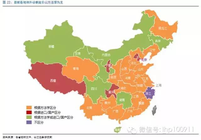 原有的定價方式大體分為按方法學、按進口國產區分、兩種方法的混用等以對方法不做不同的定價。目前近1/2省、市、自治區、直轄市采用方法學進行定價,主要集中于華東、華南、黑龍江等地。而近1/3采取方法學或進口/國產混用,主要集中于中部及北部地區,在這些地區兩種方法都有所使用。截至2014年,僅浙江省采取不分方法學定價。