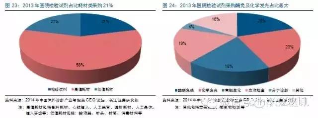下游醫院市場是體外診斷市場的主要消費終端之一。2013年國內醫院檢驗試劑采購總額約45億美元,占醫院耗材類采購總量21%,預計占全國體外診斷試劑使用量九成以上;其中化學發光與酶聯免疫試劑占比最高,分別占試劑使用量的23%、20%,血液監測占比19%,常規生化18%,分子診斷4%。