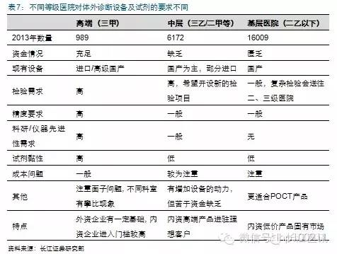 高端醫院重技術,低級醫院重成本,中級醫院是國產品牌理想客戶。高端三甲醫院由于外資產品的先入為主,加之對科研和設備品牌的追求,更有意愿使用高通量、全自動的進口產品或高端檢測方法,此外較高的門診量,病人經濟承受力也足以支撐高端設備的運作。而基層醫院由于經費和病人數目有限,難以形成規模效應,對高通量的新檢測技術需求并不大。