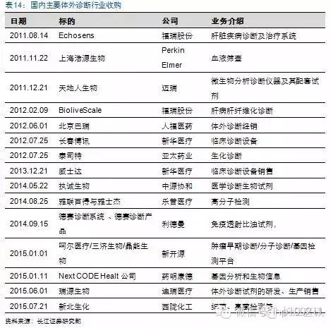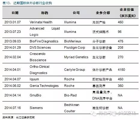 而完善產業鏈最迅速最有效的方式即為優質資產的并購,從2013年初至當前海外關于體外診斷并購已經超過10起,其中最大的為Carlyle Group對Ortho-Clinical Diagnostics的收購,價值總額41億美元。