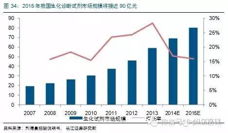 2010年,我國生化診斷試劑市場規模約為31.58 億元,我們預計,2015年我國生化試劑市場規模將接近80億元,CAGR將達到15%左右。