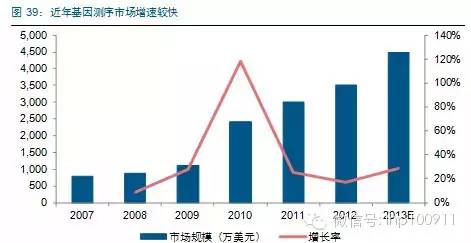 DNA測序技術共經歷了三代,自第二代誕生后,基因測序產業發展提速,全球基因測序市場容量從2007年的794.1萬美元增至2013年的45億美元,6年CAGR為33.52%。隨著技術的推廣與設備的普及,預計未來幾年全球市場仍將繼續保持高速增長。