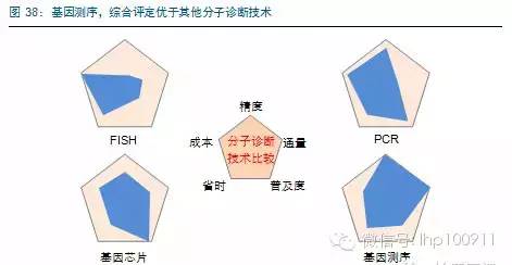 常用的基因診斷技術包括聚合酶鏈式反應(PCR)、熒光原位雜交(FISH)、基因測序以及基因芯片技術。FISH主要應用于細胞遺傳領域,如癌癥檢測、產前檢測等,精確度與靈敏度相對較低;基因芯片技術成本相對較低,檢測較為迅速,較為精準;PCR技術操作簡單、快速,但只能檢測一個或幾個基因。基因檢測技術則在精度上更為準確,可測通量更多,是最適宜個體化診斷的分子診斷技術。隨著技術的進步,成本隨之下降,基因測序將引領分子診斷技術。