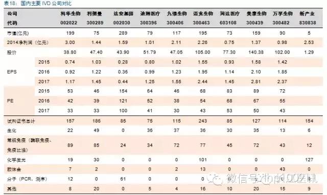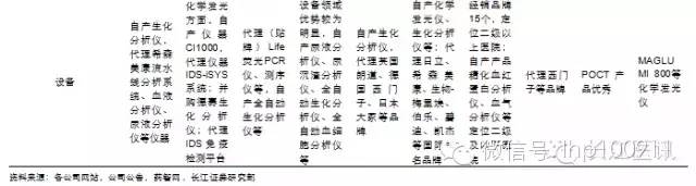目前國內市場主要上市公司標的有傳統龍頭企業科華生物、利德曼、達安基因;近期上市的如迪瑞醫療、九強生物、邁克生物、潤達醫療、美康生物等。其中達安基因、美康生物擁有第三方獨立診斷實驗室,邁克生物化學放光領域優勢明顯,萬孚生物則在POCT方面有較大優勢。