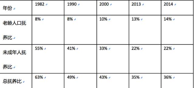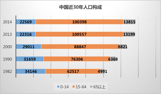 撫養比是非勞動人口與勞動人口的比例,用以表明每100名勞動年齡人口要負擔多少名未成年人和老年人。比例越大,居民生活壓力越大。從上圖可以看到,未成年人撫養比從1982年的55%驟降到2014年的22%,這表明了中國目前未成年人數量不足,未來伴隨著人口老齡化,勞動力數量將會嚴重不足,數量的不足也會傳導到人力成本的提升。為了國家經濟的可持續發展,保持健康的人口結果非常關鍵。因此今年10月29日,十八屆五中全會也做出了“全面放開二胎”的政策決定。