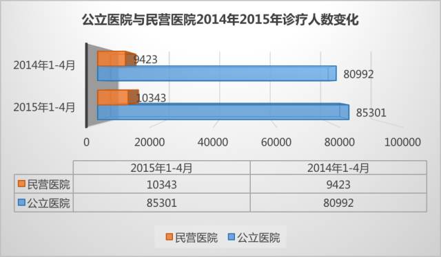 然而民營醫療數量的快速增長并不代表著其在中國醫療服務業中扮演了更大的角色。雖然民營醫院數量上同比增加了12.7%。然而,實際上,根據衛計委近期公布數據顯示:2015年1-4月,民營醫院診療人數占總量的10.42%,同比增加了0.39%,而公立醫院同比增加了5.4%。因此不管是從民營醫院診療人數占比,還是增長量,都不盡如人意。因此,民營醫療機構數量的增長并不代表民營醫院目前生存狀況良好。