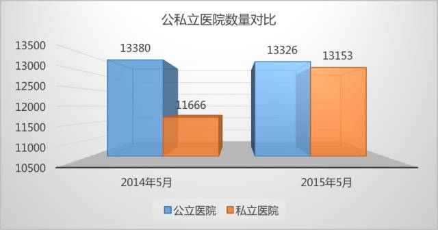 從衛計委發布的數據可以看出,截止到2015年5月,民營醫院的數量“突飛猛進”,在短短的一年時間內增長了1487家。目前,從醫院數量的角度看,民營醫院已經和公立醫院“平起平坐”。
