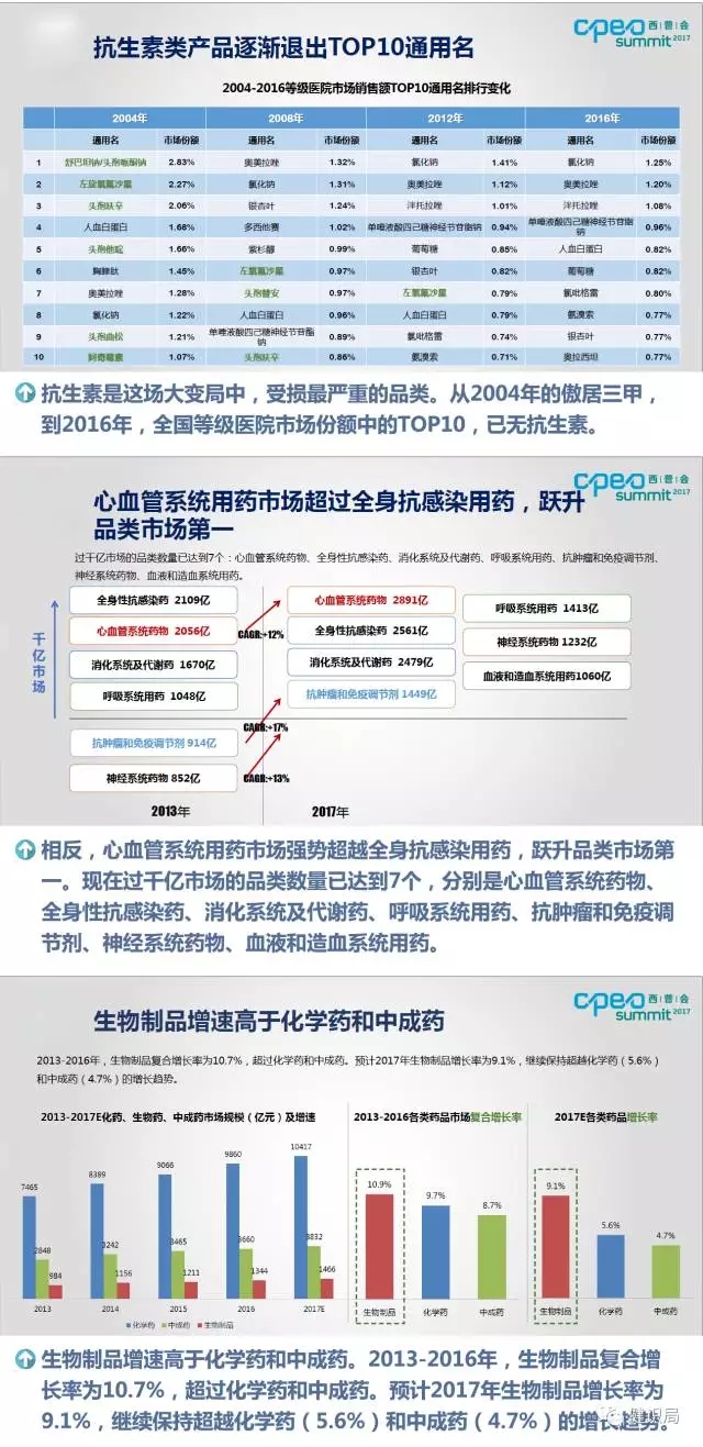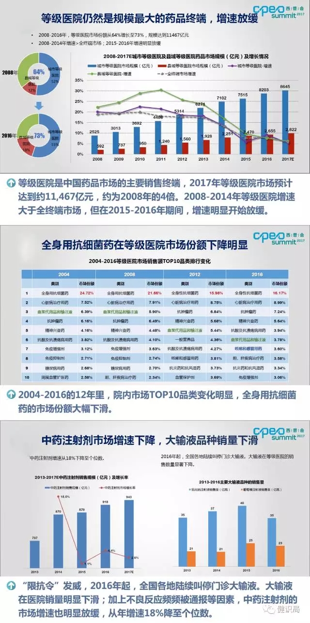 “2017年西普會”上發(fā)布的《六大終端市場結構與轉移趨勢》顯示,2016年,中國藥品最主要銷售終端——等級醫(yī)院中,抗生素的市場份額,已經退出top10;而迫于各地各級衛(wèi)生部門的“限抗令”,大輸液品種銷量明顯下滑,中藥注射劑市場增速下降。