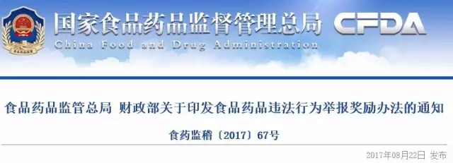 為進一步完善食品藥品舉報獎勵制度,加大對違法行為的打擊力度,構建食品藥品安全社會共治格局,國家食品藥品監督管理總局、財政部對2013年印發的《食品藥品違法行為舉報獎勵辦法》(國食藥監辦〔2013〕13號)進行了修訂,現將修訂后的《食品藥品違法行為舉報獎勵辦法》印發給你們,請遵照執行。
