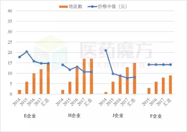 注:1)價格中值“匯總”:指該企業歷年所有省份中標價格的中值;2)地區數“匯總”:指該企業歷年有中標記錄的省份總數