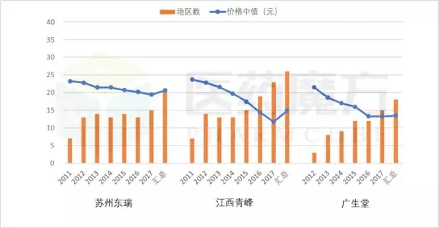 正大天晴(C企業)和江西青峰在市場策略上,更多是傾向于降低產品價格,以最大程度地換取中標市場,實現“以價換區域”。但是從數據來看,正大天晴無疑更成功一些,其產品最高降價幅度為38.8%,低于江西青峰50.2%的降幅,但其2017年中標省份達27個,高于江西青峰的23個,反映其兼具全國性的市場開拓能力和價格維護能力。
