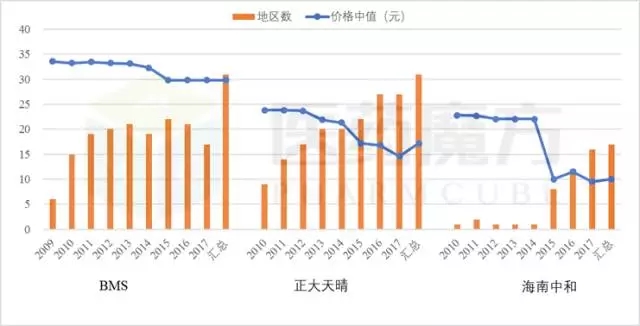 從下圖可以看出,BMS(A企業)為維持產品的高價格,主動放棄低價中標市場(也有部分是未中標)。因此,曾經陸續覆蓋過31個地區的BMS,2017年中標省份僅為17個。更詳細的中標情況可以進入魔方中標數據庫 查詢。