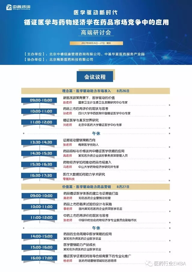 8月26日至27日,中睿咨詢將在常州再一次舉辦高端研討會,此次研討會的主題為“醫學驅動新時代——循證醫學與藥物經濟學在藥品市場競爭中的應用”。具體的研討會課題議程及邀請師資,見下圖: