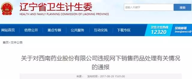 昨日(8月29日),遼寧省衛計委發布《關于對西南藥業股份有限公司違規網下銷售藥品處理有關情況的通報》,對西南藥業股份有限公司及其經銷商遼寧一鼎醫藥有限公司作出相應處罰。