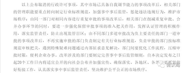 3、改革涉及的部門要制定完善事中事后監管細則,自本決定發布之日起20個工作日內將適宜公開的向社會公布并加強宣傳、確保落實。各地區、各部門要抓緊做好銜接工作,認真落實事中事后監管責任,堅決維護公平公正的市場秩序。