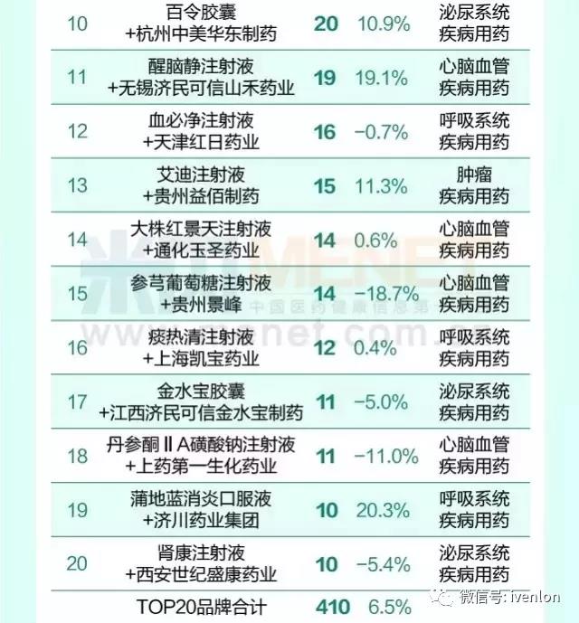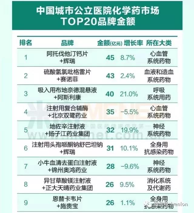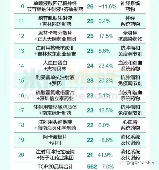 全國(guó)醫(yī)院市場(chǎng)銷(xiāo)售超10億的20個(gè)藥品
