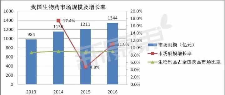 根據中康CMH的數據,我國生物藥市場規模保持持續增長趨勢,2016年增長到1344億元。