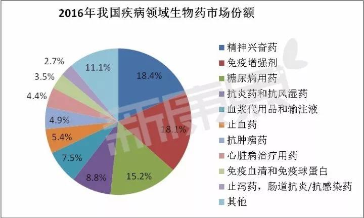 從疾病領域的市場份額來看,中康CMH的數據顯示,2016年top10的生物藥治療領域依次為:精神興奮藥(18.4%)、免疫增強劑(18.1%)、糖尿病用藥(15.2%)、抗炎藥和抗風濕藥(8.8%)、血漿代用品和輸注液(7.5%)、止血藥(5.4%)、抗腫瘤藥(4.9%)、心臟病治療用藥(4.4%)、免疫血清和免疫球蛋白(3.5%)、止瀉藥,腸道抗炎/抗感染藥(2.7%)。