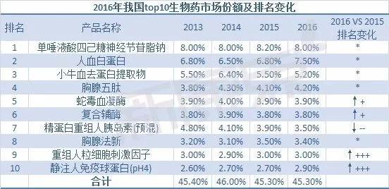 中康CMH的數據顯示,2013-2016年top10生物藥的市場合計占整個生物藥市場的份額均在45%左右,2016年合計市場份額為45.3%。其中,單唾液酸四己糖神經節苷脂鈉連續4年蟬聯市場冠軍,top4的排名在2013-2015年的排名均沒有發生變化;重組人粒細胞刺激因子和靜注人免疫球蛋白(pH4)的上升速度最快,均上升了三名;蛇毒血凝酶和復合輔酶均上升一名;用于糖尿病的精蛋白重組人胰島素(預混)則下降了兩名。