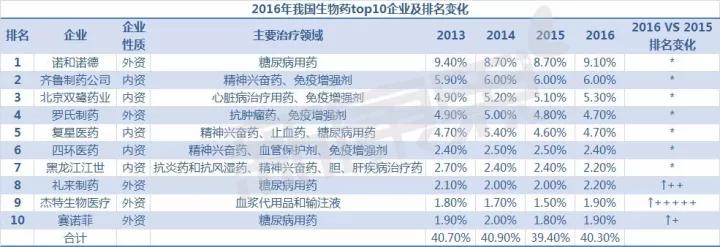 中康CMH的數據顯示,2016年我國生物藥top10企業合計占40.3%的市場份額,內資和外資企業各占5席,其中外企諾和諾德連續四年名列生物藥市場榜首,據了解,諾和諾德在中國的產品主要是降糖藥胰島素和止血藥重組人凝血因子VIIa。進入top10的5家國內企業分別是齊魯制藥、北京雙鷺藥業、復星醫藥、四環醫藥、黑龍江江世。其中, top7的排名在2013-2015年的排名均沒有發生變化;排名上升的均是外資企業,其中杰特生物醫療的上升速度最快,上升了五名,該企業只有血漿代用品和輸注液的人血白蛋白產品;另外兩家企業是禮來制藥和賽諾菲,分別上升了兩名、一名;禮來制藥在中國的生物藥主要是用于治療糖尿病的胰島素和骨病治療的特立帕肽;賽諾菲在中國的生物藥主要是用于治療糖尿病的胰島素和抗病毒、抗細菌的疫苗類。
