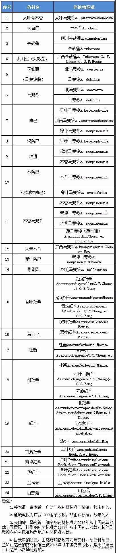 附:可能含有馬兜鈴酸的馬兜鈴科藥材名單:24種