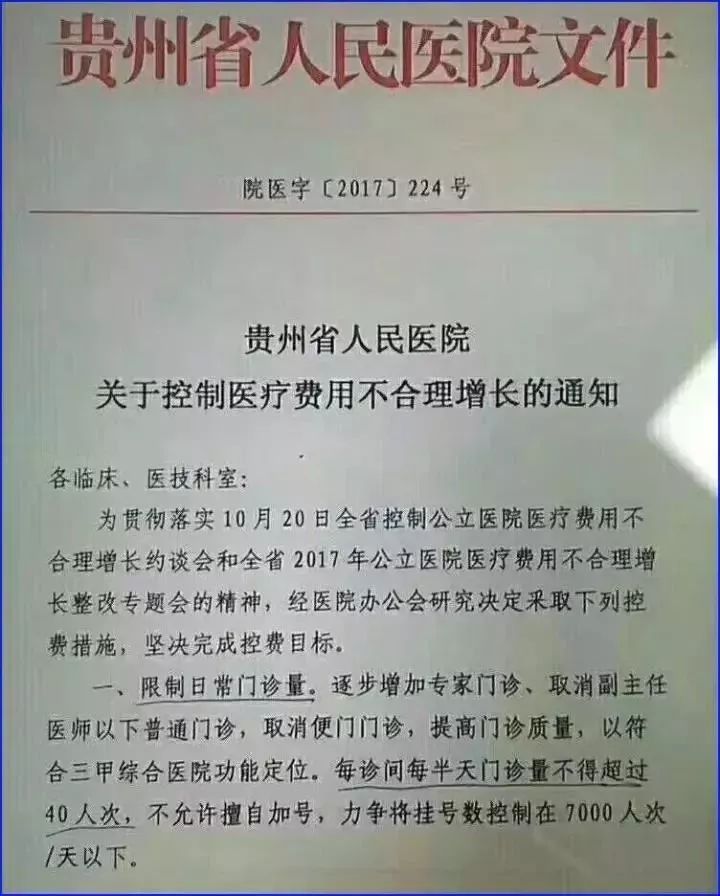 近日,根據網絡消息,貴州省人民醫院發布通知:限制日常門診量,逐步增加專家門診、取消副主任醫師以下普通門診。