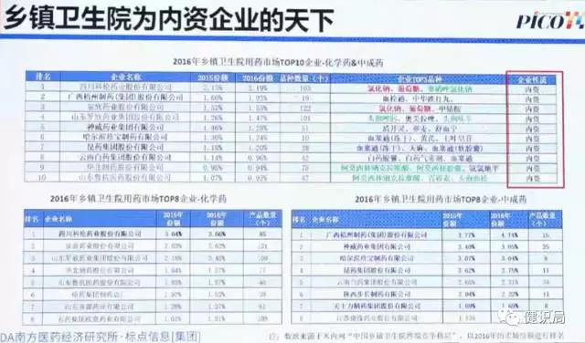 基層公立醫療機構的另一個重要(藥品使用)終端——鄉鎮衛生院,則是內資企業的天下。從上圖可以看出,2016年鄉鎮衛生院用藥市場(包括化藥和中成藥),排名前10位的企業均為內資企業,共占據這一市場總體份額的13.67%。