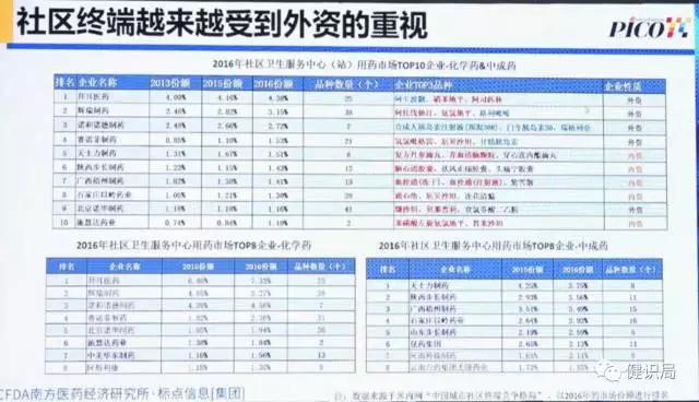 2016年,上述5家外資藥企占據城市社區醫療用藥終端12.94%的市場份額,比2015年增長1.02%。