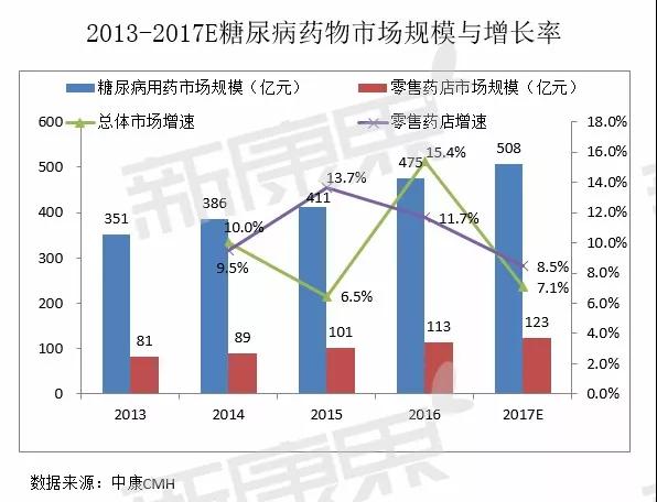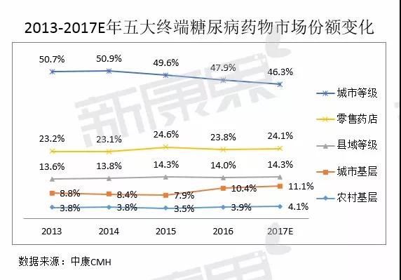 基層醫院得益于分級診療的全面推進,市場份額提高至14%。零售藥店份額占比為24%。隨著醫保控費等政策的逐漸落地,以及醫藥分家、處方外流等政策的推進,醫院渠道份額將逐年下降。2017年零售藥店糖尿病市場份額將保持增長趨勢,預計增速將高于總體市場。