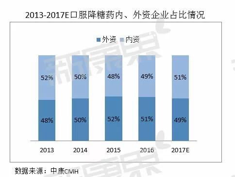 在零售藥店渠道口服降糖藥市場,內、外資企業各占半壁江山。2016年外資企業略勝一籌,占據51%的份額,而內資企業占據49%的份額。不過,內資企業之所以有這樣的市場表現,得益于廠家數量眾多,各廠家份額相對較小,而外資企業則相反。