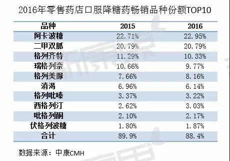 據中康CMH監測數據顯示,2016年零售藥店口服降糖藥暢銷品種TOP10份額占比為88.4%,市場集中度較高。TOP10品種全部為單方制劑,而相對更高效、便捷的復方制劑在零售藥店具有巨大的發展空間。