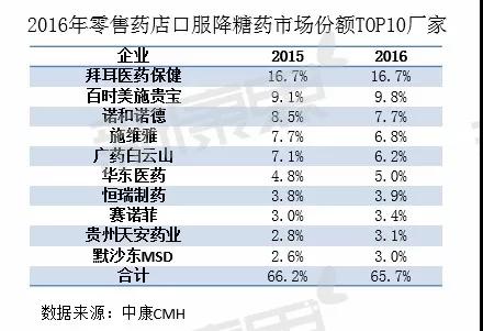 在TOP10廠家份額排名中,內資企業表現稍落后于外資企業。2016年零售藥店口服降糖藥TOP10廠家份額占比為65.7%,市場集中度高。其中外資企業6家,份額合計47.5%,內資企業4家,份額合計18.2%。