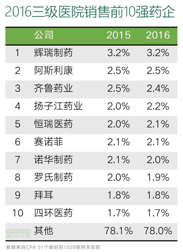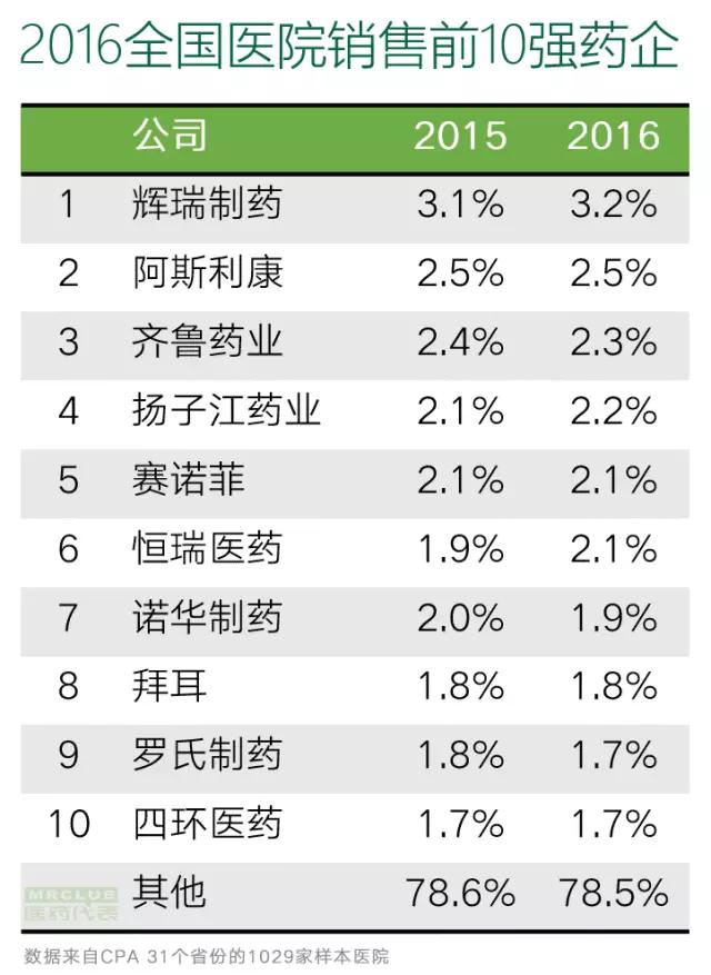 2016年國(guó)內(nèi)醫(yī)院銷售排名10強(qiáng)藥企