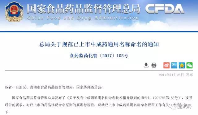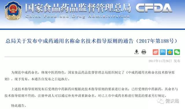 今天(11月28日),國家食品藥品監督管理總局(簡稱CFDA)印發《中成藥通用名稱命名技術指導原則》,明確將“科學簡明,避免重名”,“必要、合理”,“避免暗示、夸大療效”和“體現傳統文化特色”四項作為中成藥命名的基本原則。