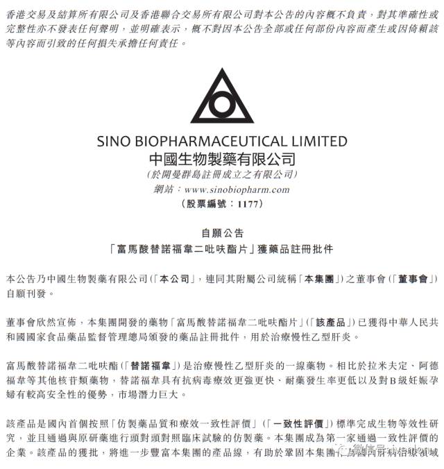 “董事會(huì)欣然宣布,本集團(tuán)開發(fā)的藥物「富馬酸替諾福韋二吡呋酯片」(「該產(chǎn)品」)已獲得中華人民共 和國國家食品藥品監(jiān)督管理總局頒發(fā)的藥品注冊批件,用於治療慢性乙型肝炎。