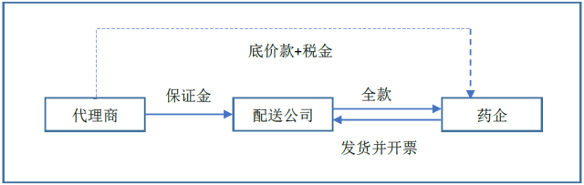 為保證“票、貨、款”一致,商業配送公司須直接支付對應的預付款。有些地區相對較弱的配送公司為留住或搶下代理商,主動墊付預付款;而一些較強勢的配送公司則是要代理商承擔該款項,承擔的形式主要包括代理商個人/公司支付履約保證金給配送公司或直接支付款項給藥企(一般是體系外賬戶,支付金額為底價款加稅金)。