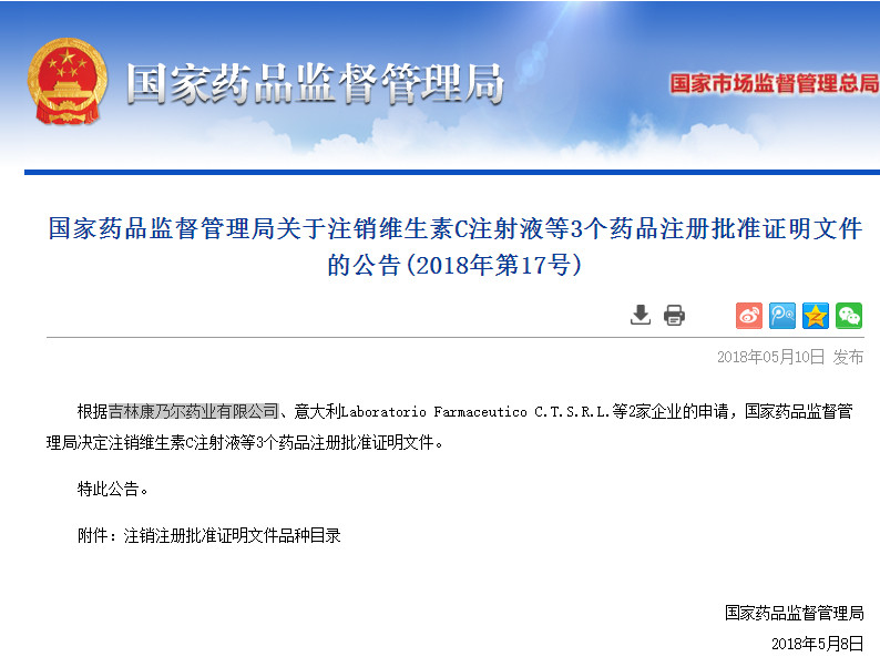 昨日(5月10日),國家藥監(jiān)局發(fā)布《國家藥品監(jiān)督管理局關(guān)于注銷維生素C注射液等3個藥品注冊批準證明文件的公告(2018年第17號)》。