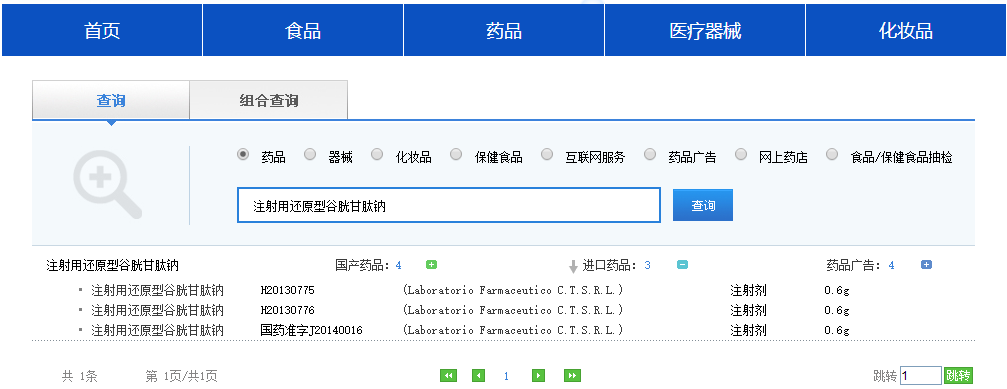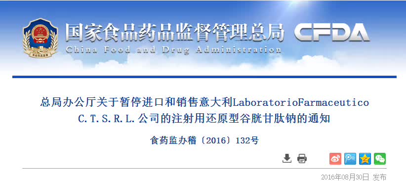 食藥監(jiān)管總局決定立即暫停進口和銷售意大利Laboratorio Farmaceutico C.T.S.R.L.公司的注射用還原型谷胱甘肽鈉,期間,暫停對該進口品種相關(guān)注冊申請的審評審批工作。