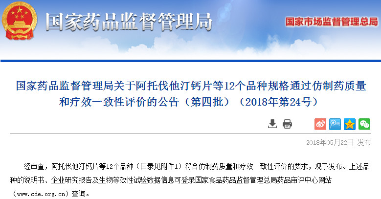 今天(5月22日),國家藥品監督管理局公布《關于阿托伐他汀鈣片等12個品種規格通過仿制藥質量和療效一致性評價的公告(第四批)》。